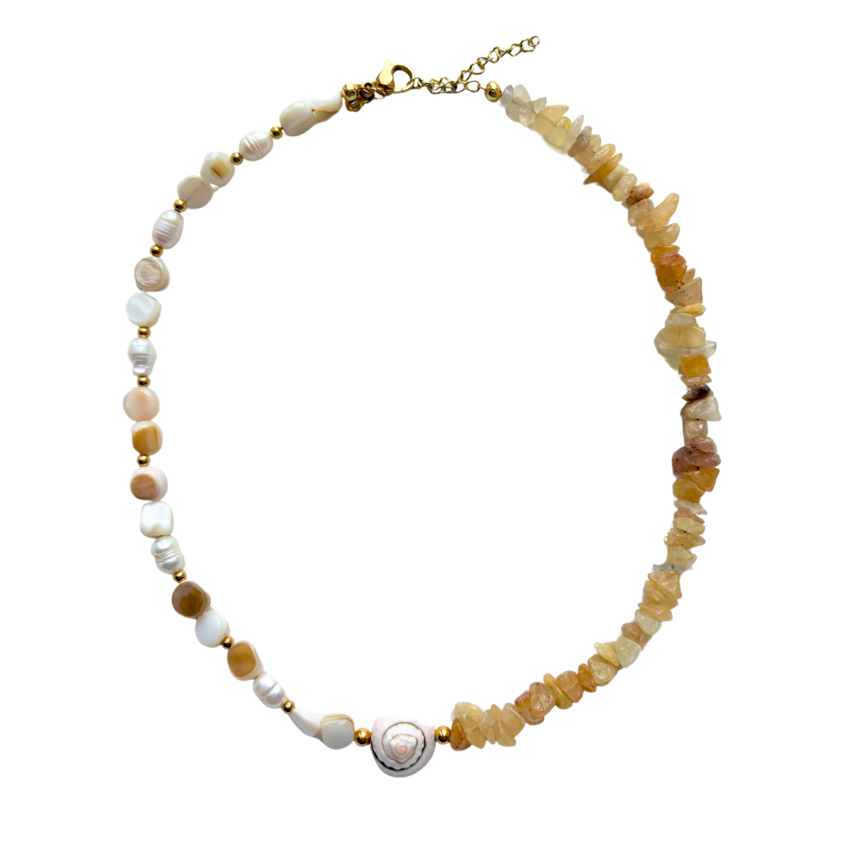 From golden beaches to your every day met Ketting Beige Beach. De ketting is ontworpen met kralen in prachtige tinten, gecombineerd met goud stainless steel en een shell statement piece.