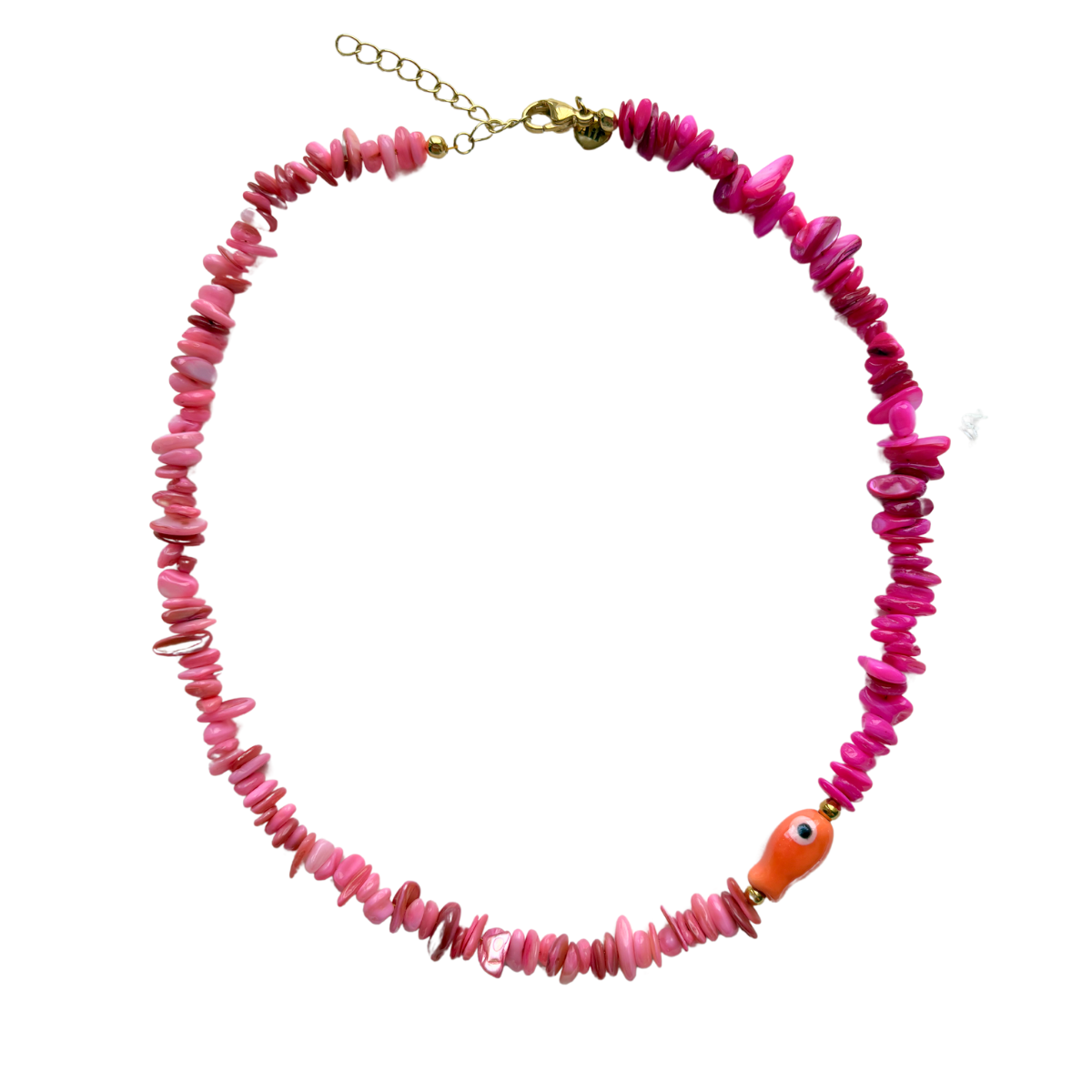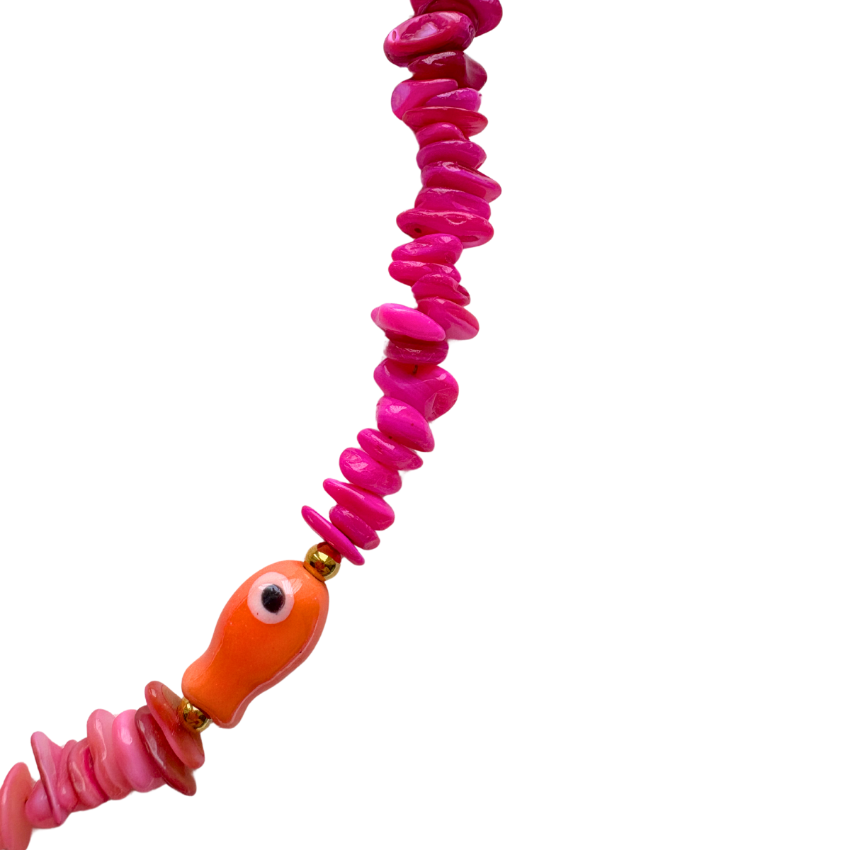A splash of color from the depths of the sea met Ketting Coral Crush. De ketting is ontworpen met kralen in prachtige tinten, gecombineerd met goud stainless steel en een fish statement piece.