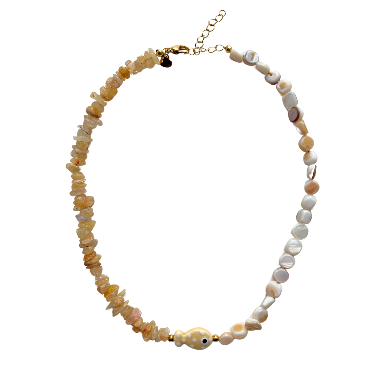 From golden beaches to your every day met Ketting Golden Sands. De ketting is ontworpen met kralen in prachtige tinten, gecombineerd met goud stainless steel en een fish statement piece.