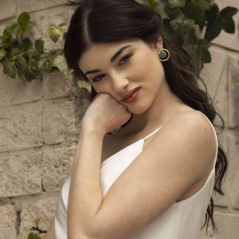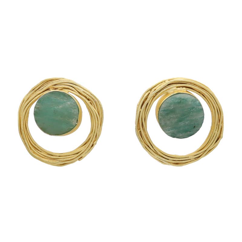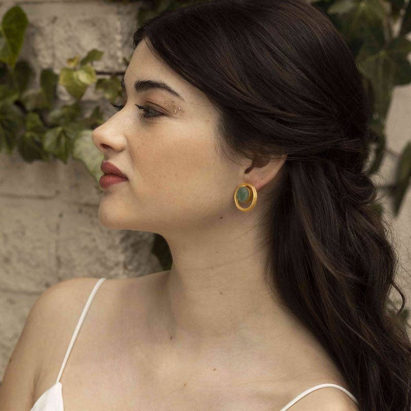 Verfijnde oorbellen met reliëf, bestaande uit twee cirkels waarvan de binnenste is ingelegd met amazonietsteen. De combinatie van goud en zachtgroen geeft een tijdloze, frisse uitstraling die elke look laat stralen, perfect voor dagelijks gebruik én speciale gelegenheden.