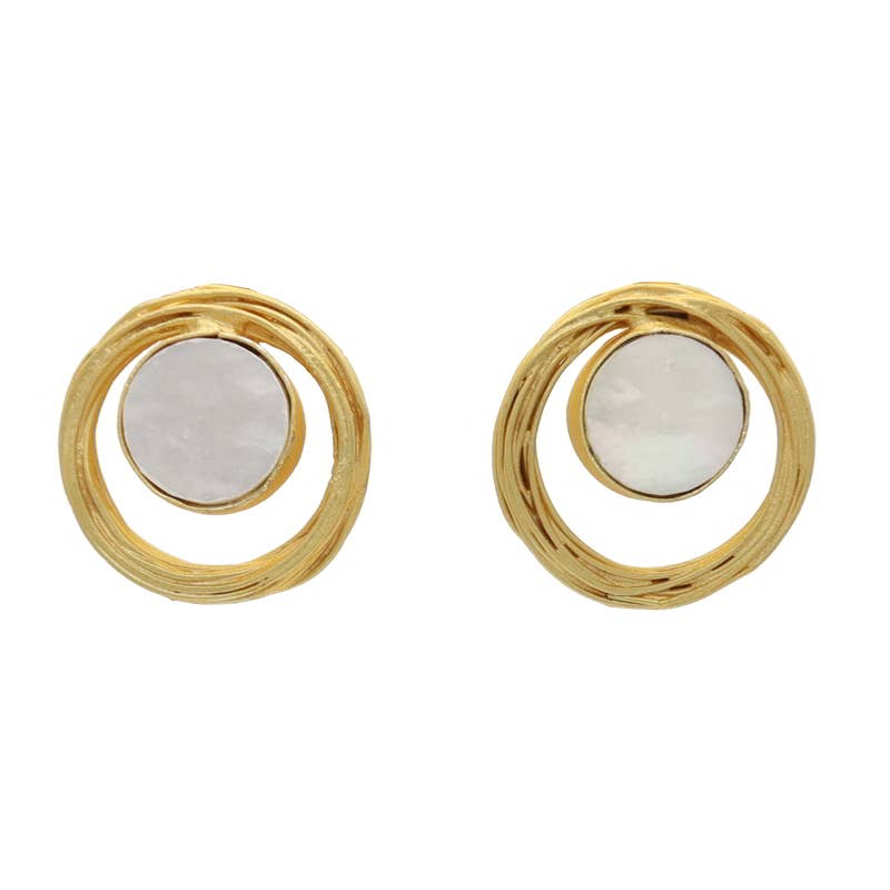 Elegante oorbellen met reliëf, gevormd door twee cirkels waarvan de binnenste is ingelegd met een witte natuursteen. Het gouden ontwerp geeft een tijdloze, verfijnde uitstraling die zowel overdag als ’s avonds perfect past.