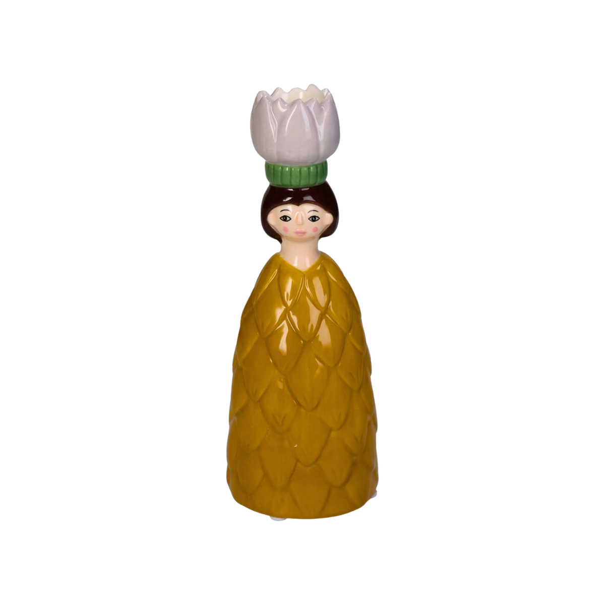Instant vrolijk word je van deze kandelaar in de vorm van een bloemenmeisje! Met haar bloemenjurk en een tulp als kaarshouder is ze een echte blikvanger op tafel of in een open kast.