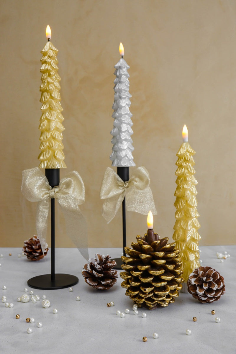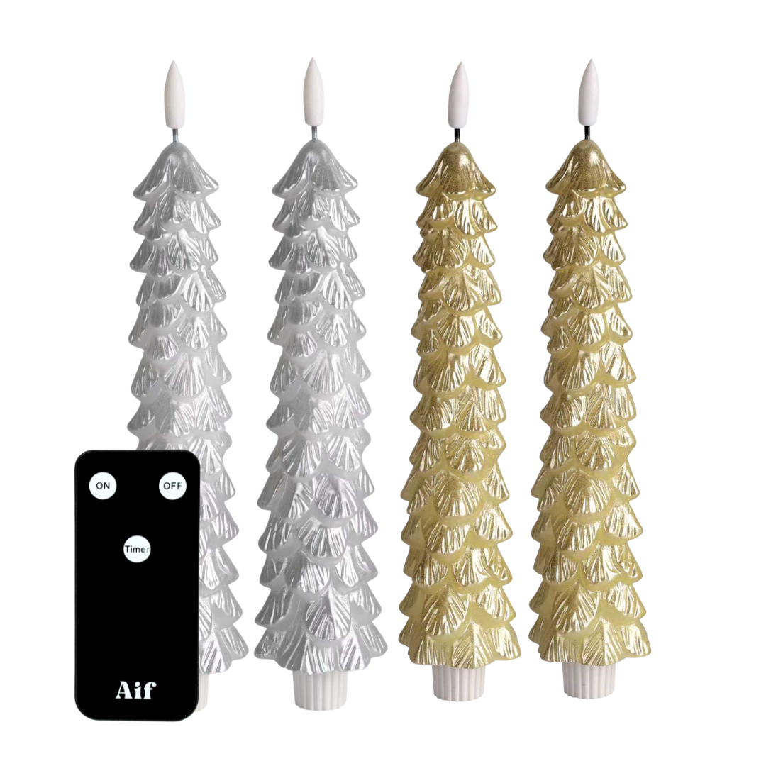 Een feestelijke combinatie van zilver en glanzend goud. Deze LED kaarsenset bestaat uit de set van 2 zilveren kerstboomkaarsen en een set van 2 gouden kerstboomkaarsen. Gemaakt van 100% paraffinewax, met een realistische LED-vlam en handige timerfunctie. De warme gloed en luxe afwerking zorgen voor een stijlvolle, veilige en gezellige kerstsfeer in huis.