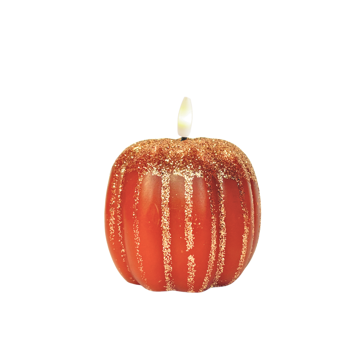 LED pompoenkaars met een volle, ronde vorm en een glitterafwerking voor een warme, feestelijke uitstraling. De LED vlam geeft een zacht warm wit licht met een lichte flikkering. Leuk als losse decoratie of in combinatie met andere pompoenvormen tijdens het herfstseizoen.
